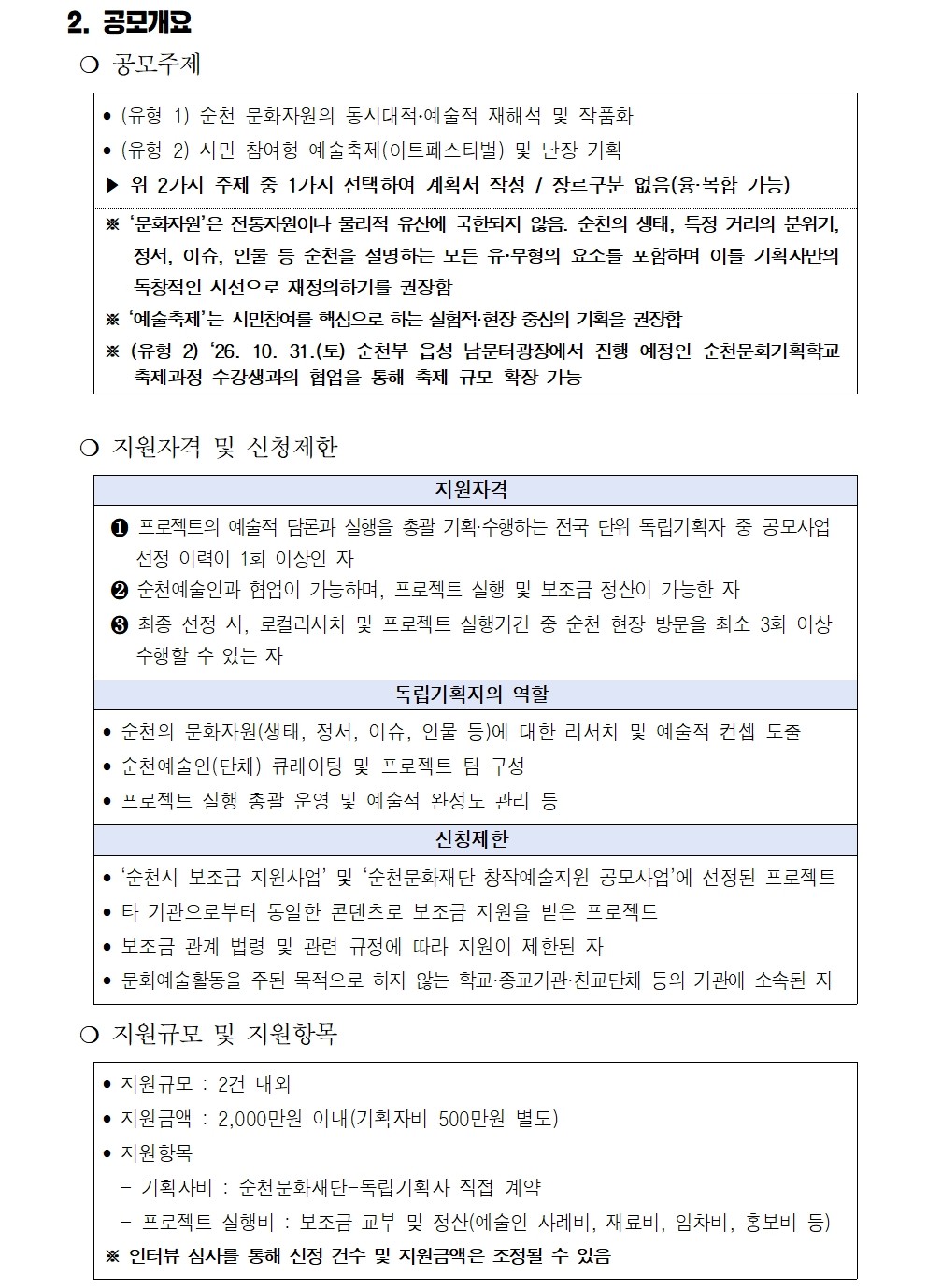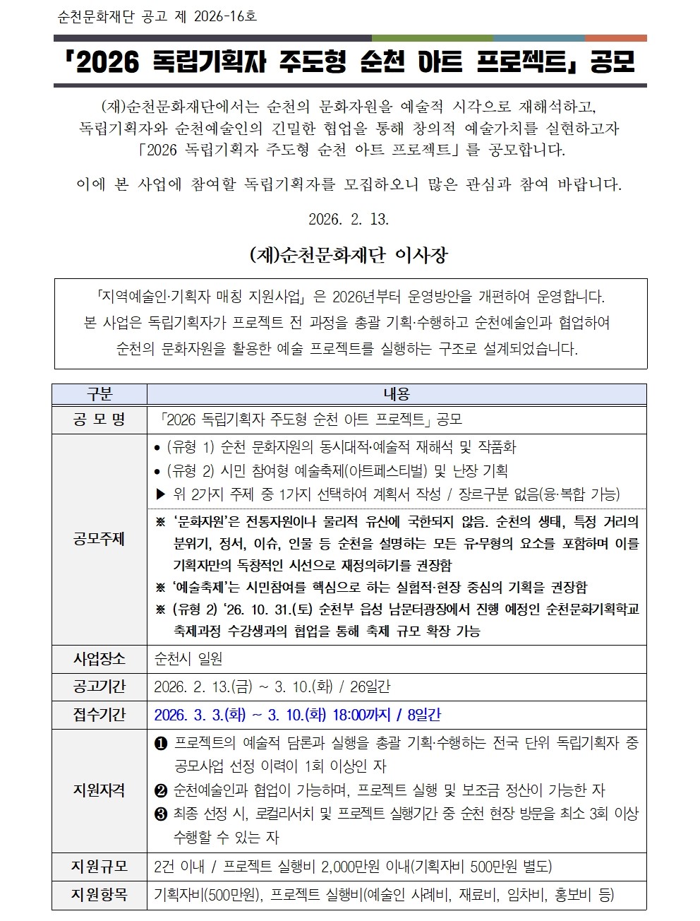 「2026 독립기획자 주도형 순천 아트 프로젝트」공모